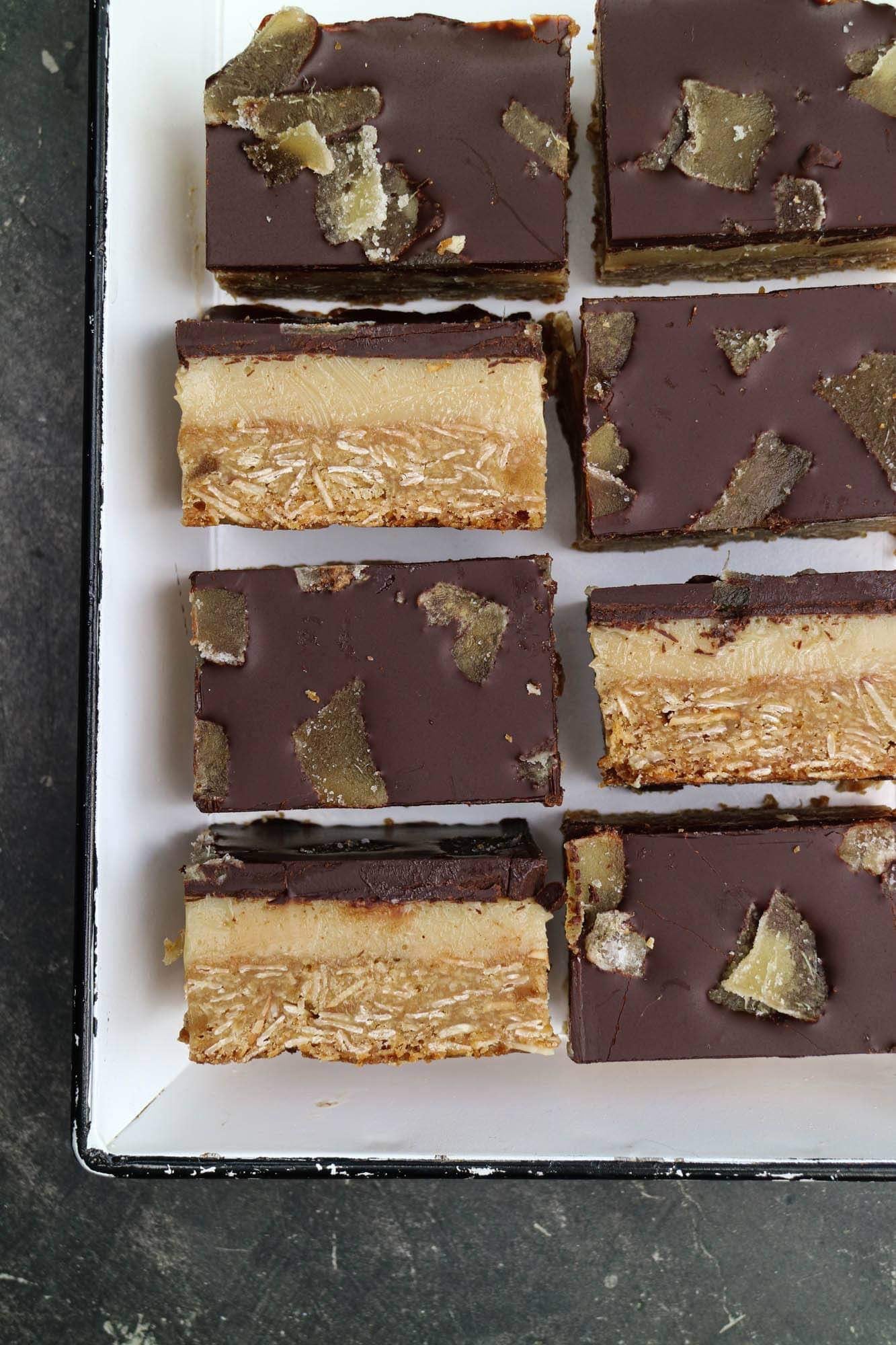 Caramel infused with ginger, ginger oaty base, dark chocolate top (72%) and crystallised ginger.